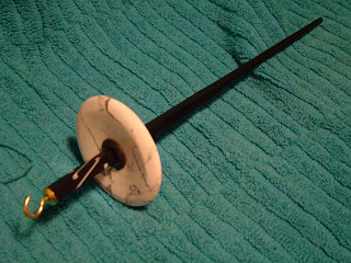 And wanted to show you something that is in progress. A very special piece.. You know me, right? if my underwear has to match the clothing I am wearing above, why wouldn't the spindle match the wool I am spinning on it? Yep, I have orange, blue, even red spindles (good thing though that natural wood kinda matches everything)...For a long time now, I keep thinking how, and from what could spindles made from here...this seems to be a god start, eh? The whorl is white stone, the dovel is black hardwood (gosh I had a hell of a time screwing the hook into it) wuth a bit of white decoration. Too bad finding the pieces are not easy here, and because of the stone, kind pricey to boot... but once someone falls in love with spinning... one can never have enough spindles, right?